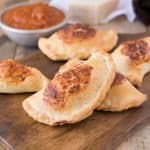 On a floured surface, roll out 1 ball to a 4 1/2 inch round, about 1/8 inch thick. Place half a teaspoon of marinara sauce in the center and add 1 teaspoon cheese and a slice of ham, leaving a border around the edge. Fold the dough in half over the filling and press to seal using your fingers or a fork.